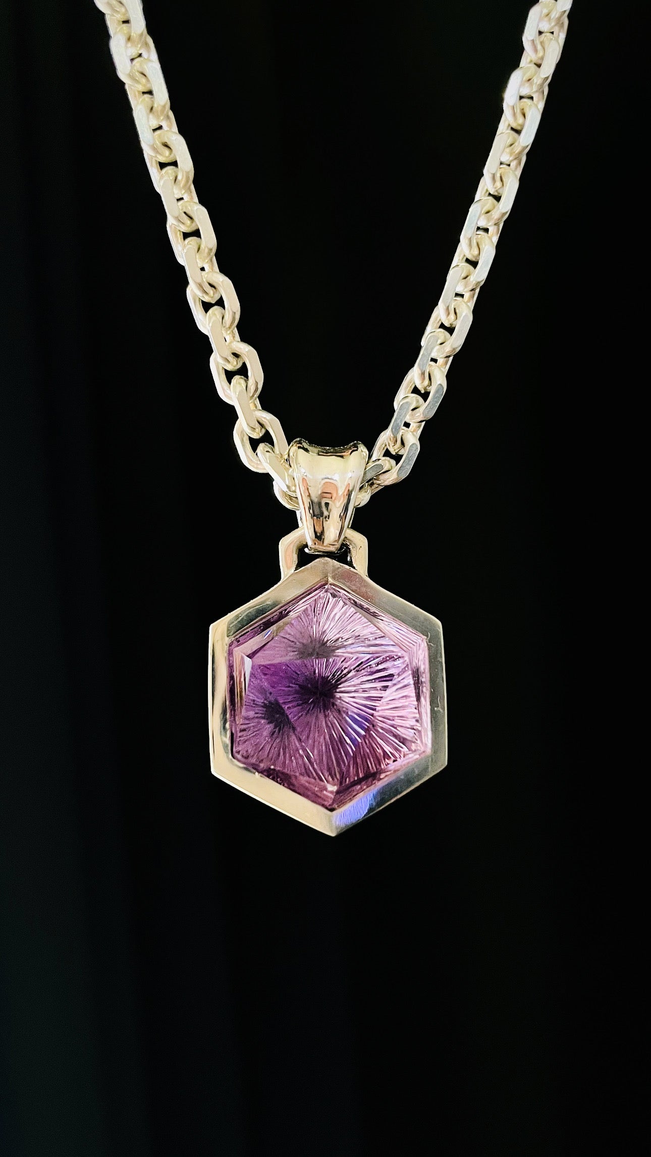 This is a Sterling Silver pendant with a unique cut of amethyst. This particular cut is called a fantasy cut. The design was inspired by industrial design.