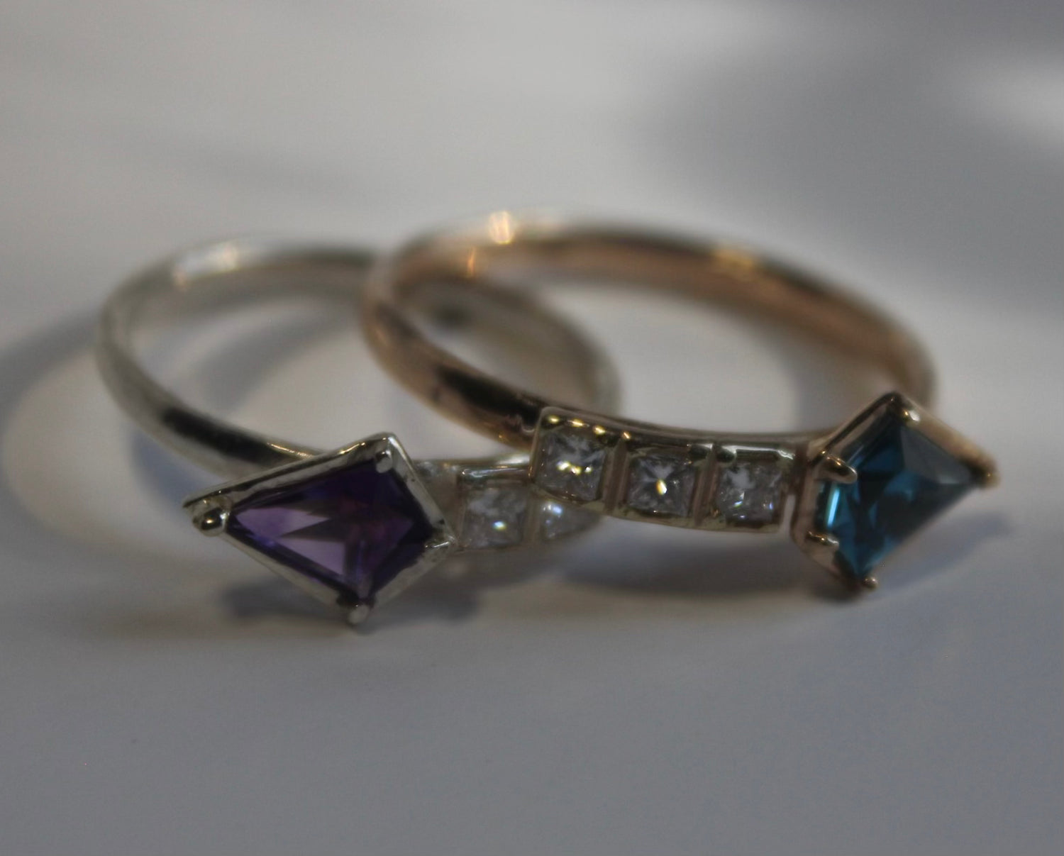 A matching pair of rings. These were inspired by the shape of a snake's head. The gold one is a Blue Zircon ring with natural Diamonds. The silver one is Amethyst also with Diamonds.