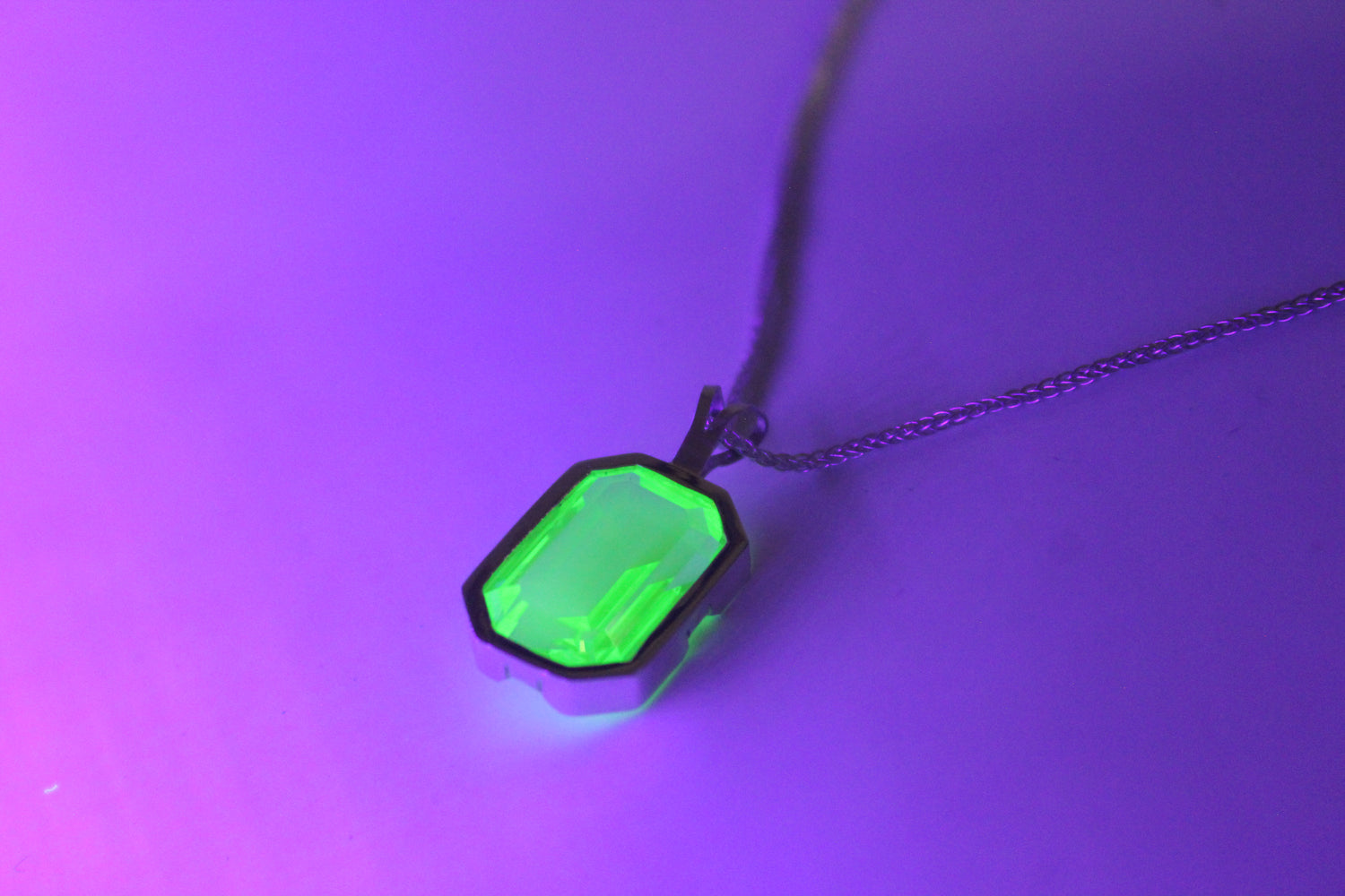 A silver pendant with an emerald cut uranium glass. This image was taken under UV light to showcase the glow that Uranium Glass is known for.