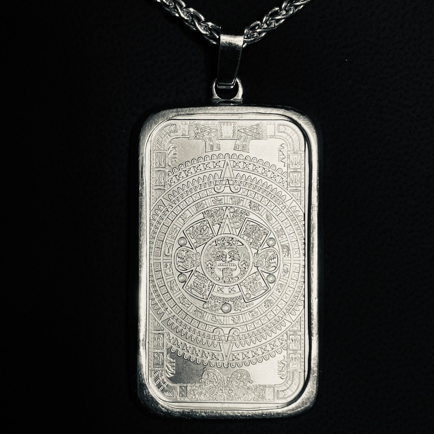 This is a one ounce pure silver Aztec Calendar Bullion Pendant. It is set in a Sterling Silver Bezel