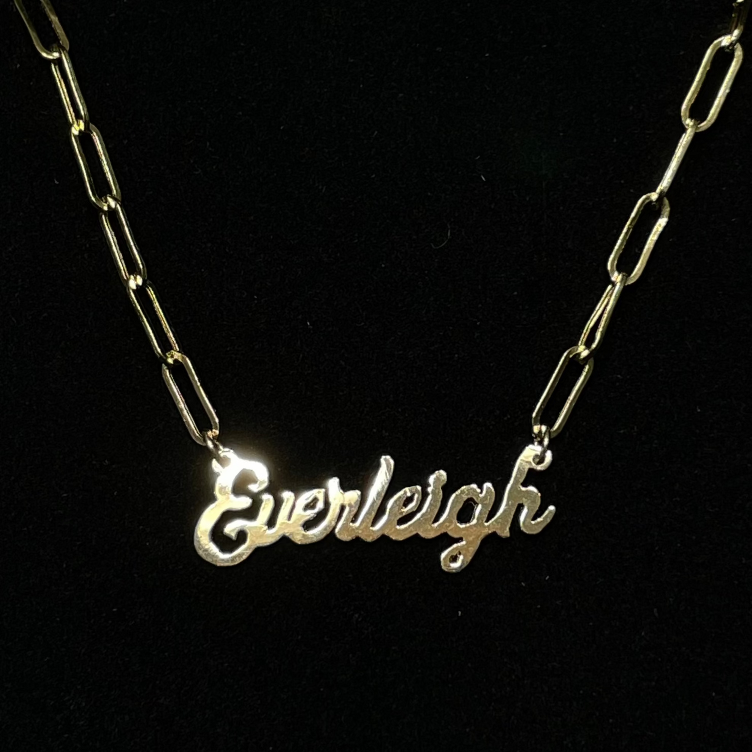 A hand cut 14k Yellow Gold name pendant necklace. The link style on this one is staple link. Feel free to email us to get one of these started.