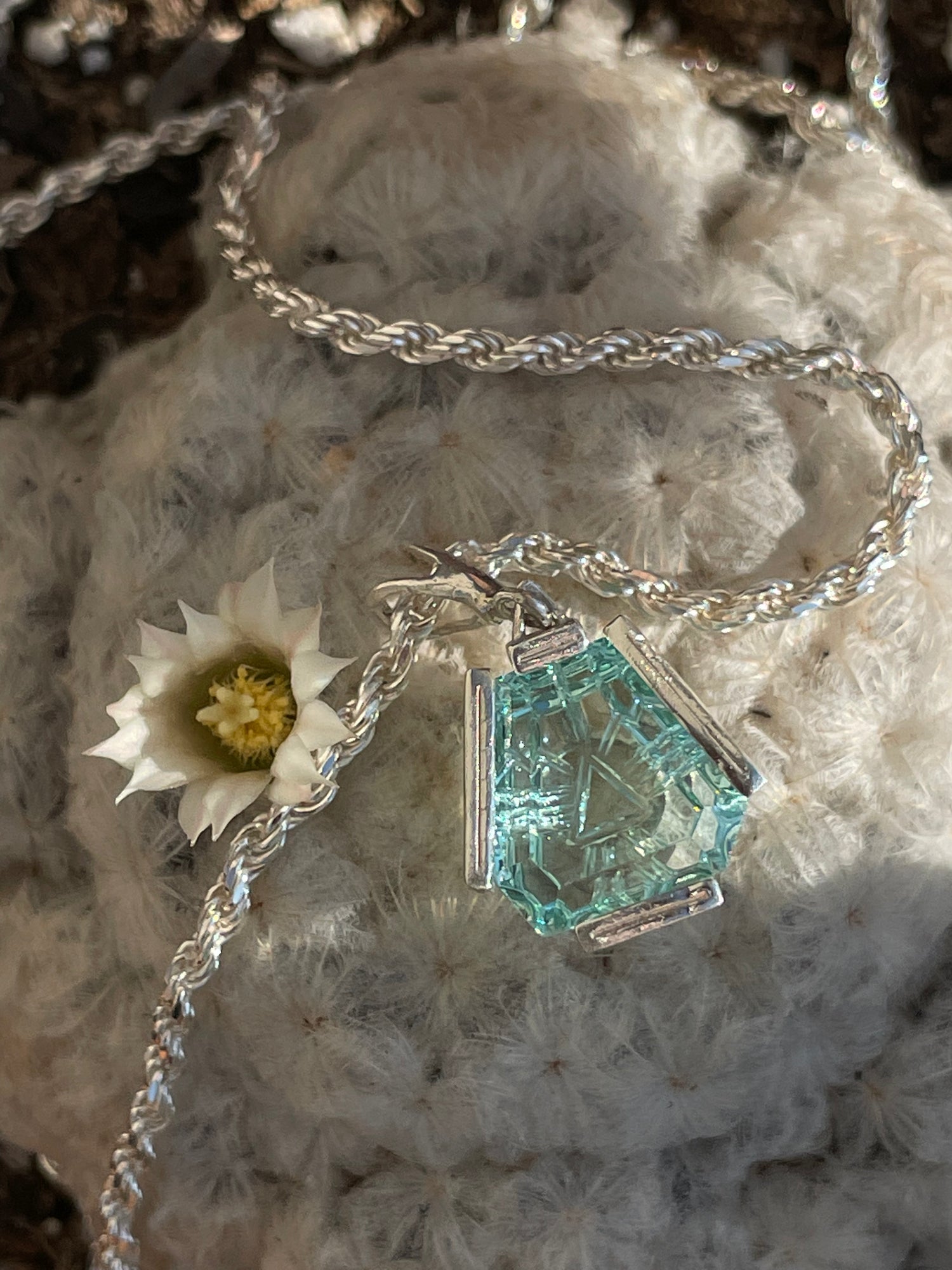 Unusual shepe carved Blue Topaz set in sterling silver. This is another of my futuristic inspired designs.