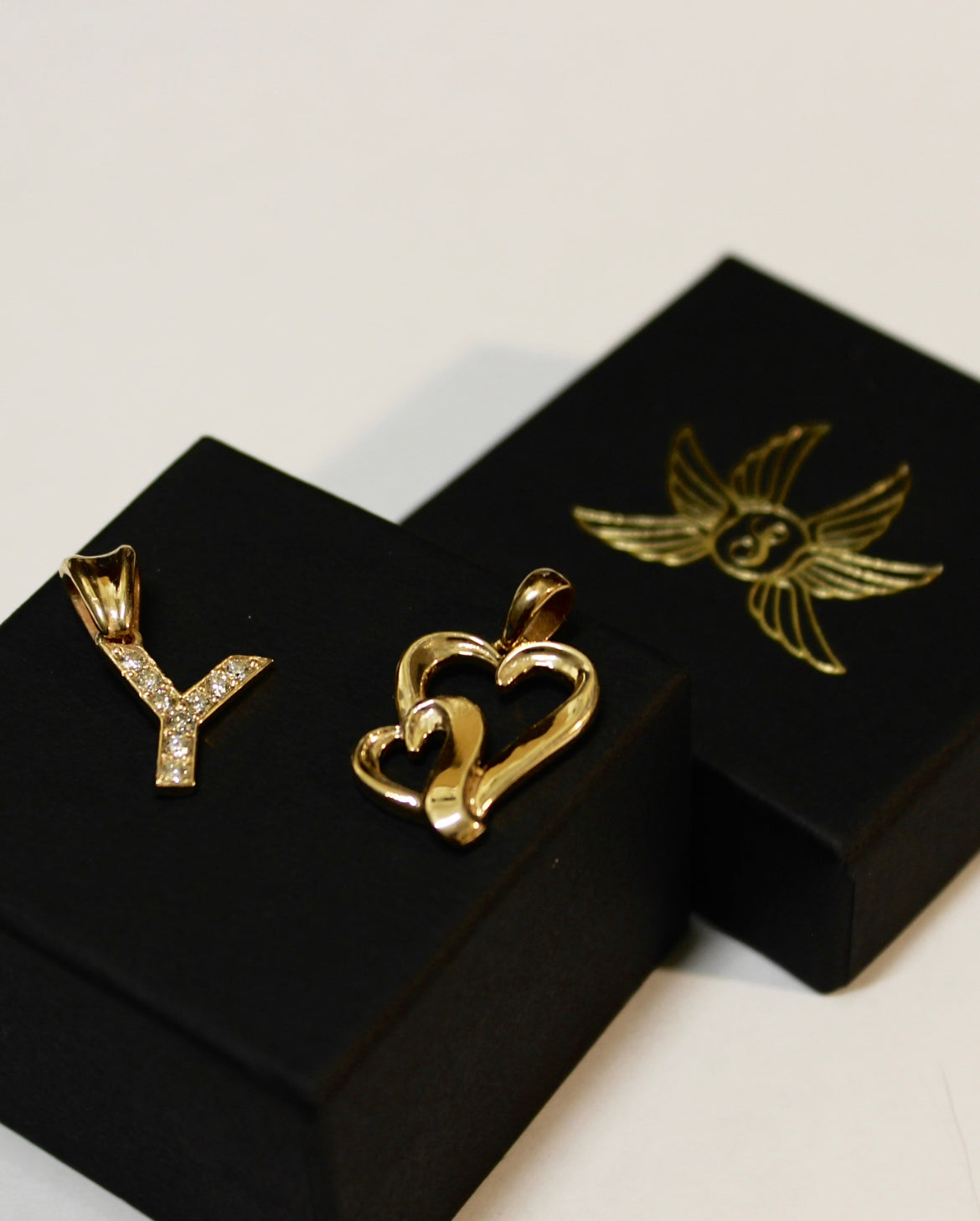 A custom Y pendant with Natual diamonds with an accompanying Yellow Gold Heart Pendant.