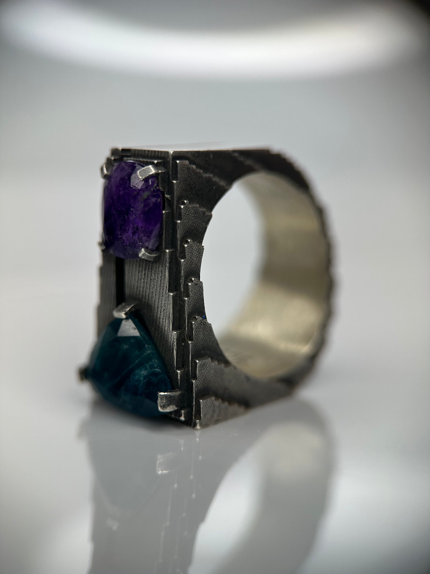 This is a futuristic/brutalist style ring in silve with purple Hackmanite & Green Hauyne. These stones also glow under UV light