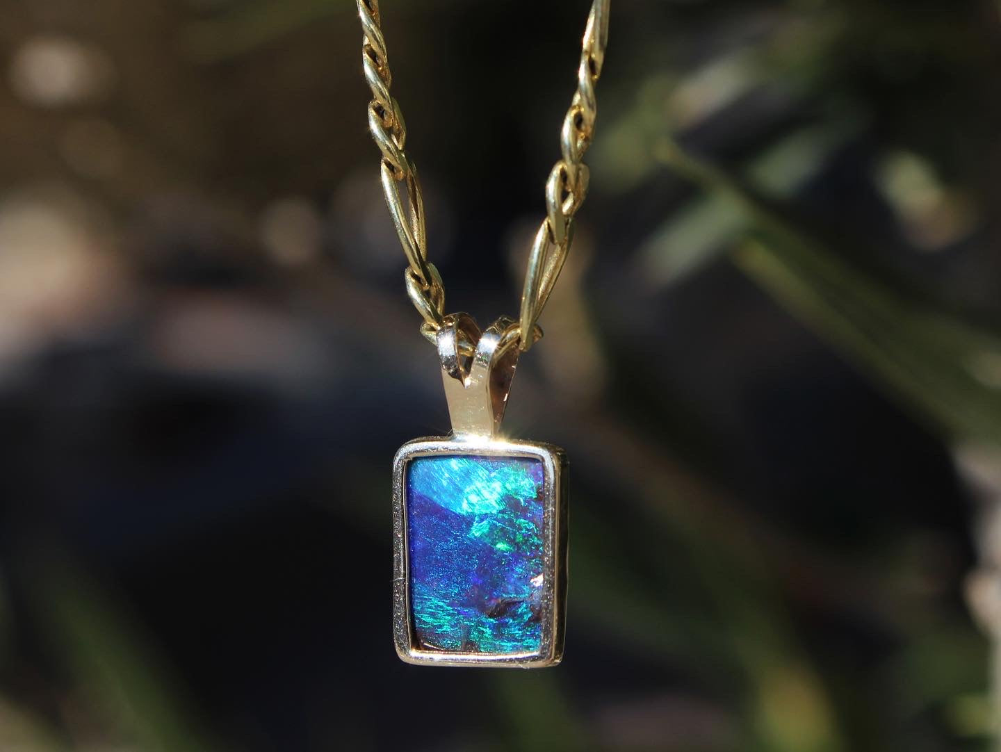 This is a Boulder Opal pendant set in a 14k yellow gold bezel.