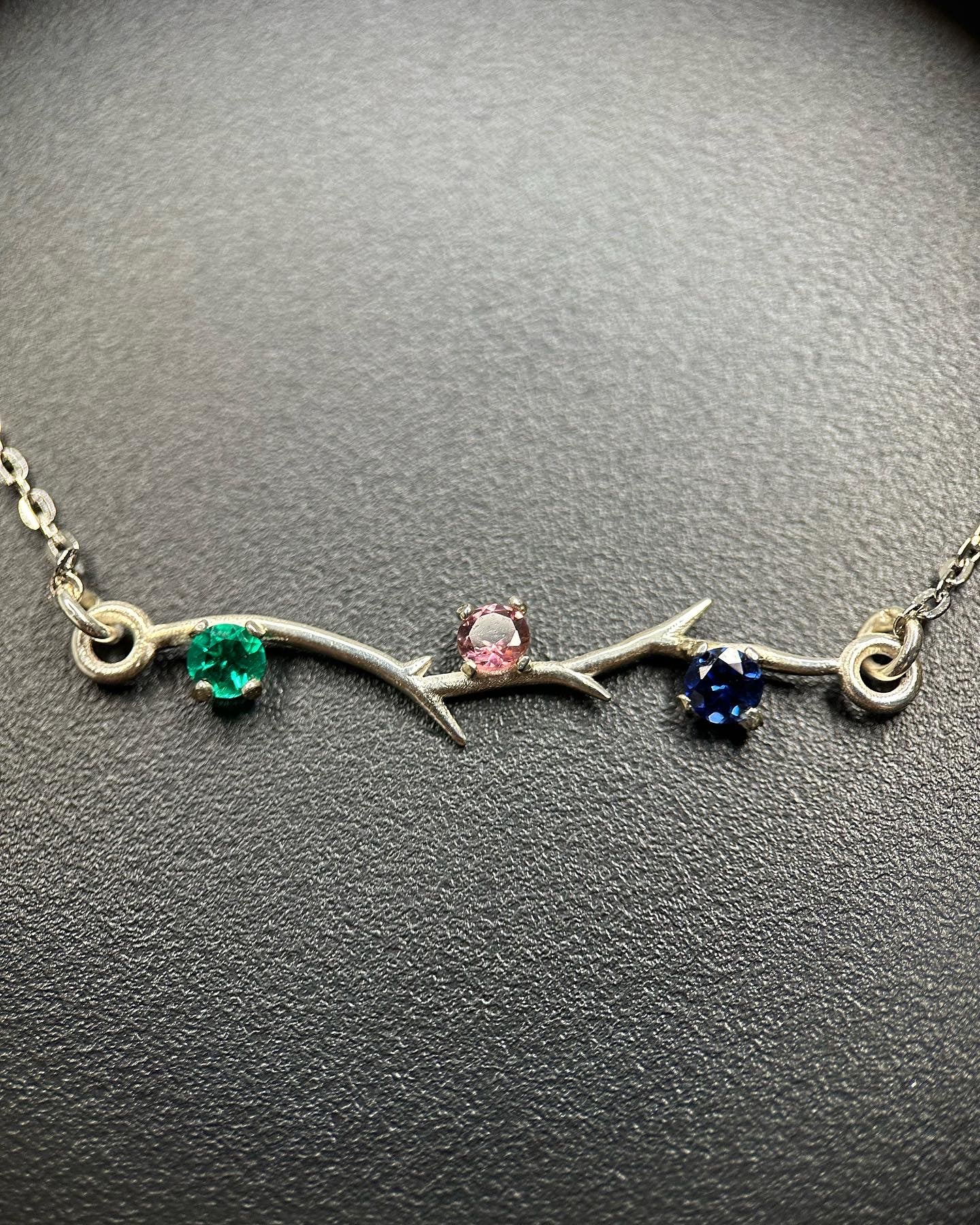 A pendant I made for a mom. The three stones symbolize each child's birthstone. The stones are Emerald, Pink Tourmaline & Sapphire