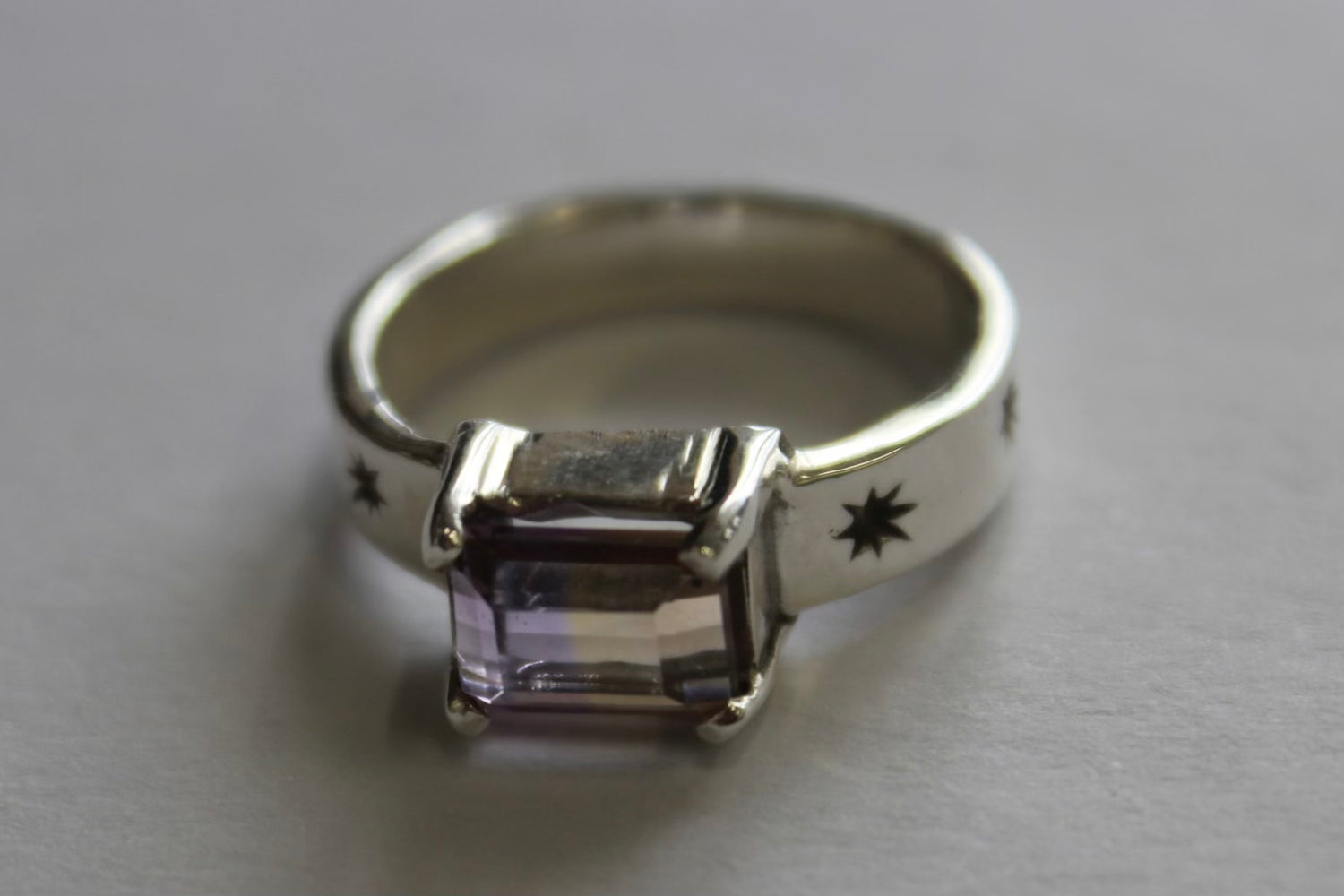 A nice Sterling silver ring with stars on the band set with an Ametrine.
