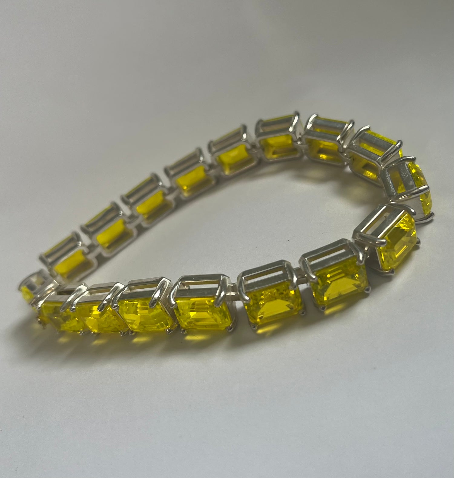 A nice vivid tennis bracelet set with Yttrium Garnets. These bright yellow stones also glow a bright yellow under UV light
