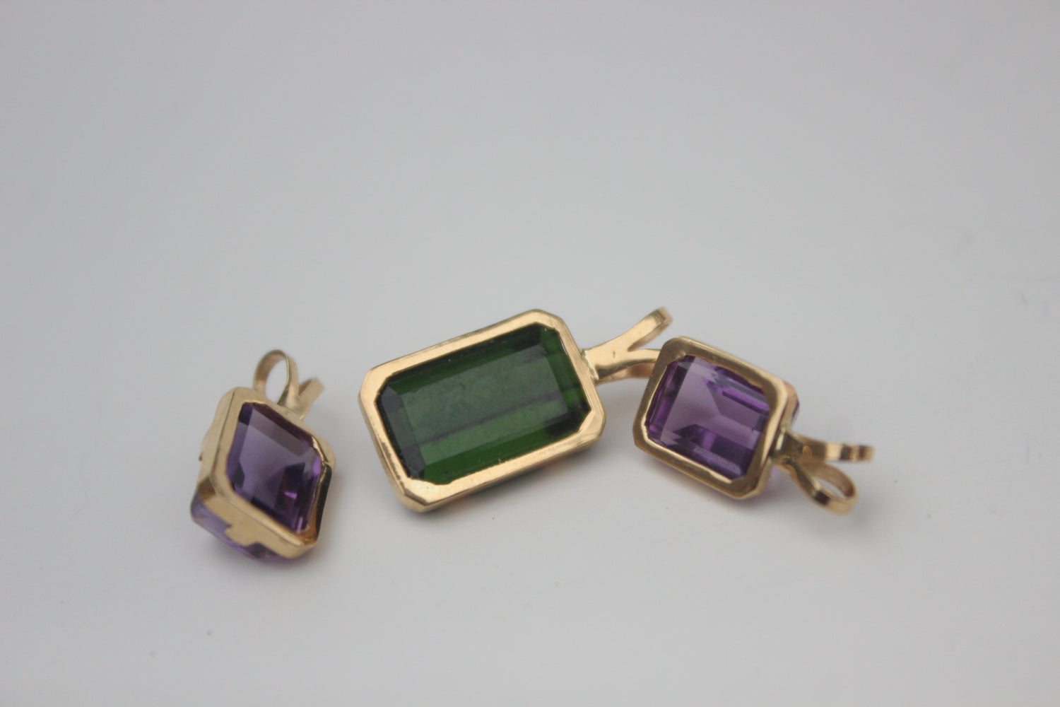 These are my famous open back bezel pendants. Its a gold bezel with an open back to allow light to pass thru better. These particualr stones are Amethyst & Green Tourmaline