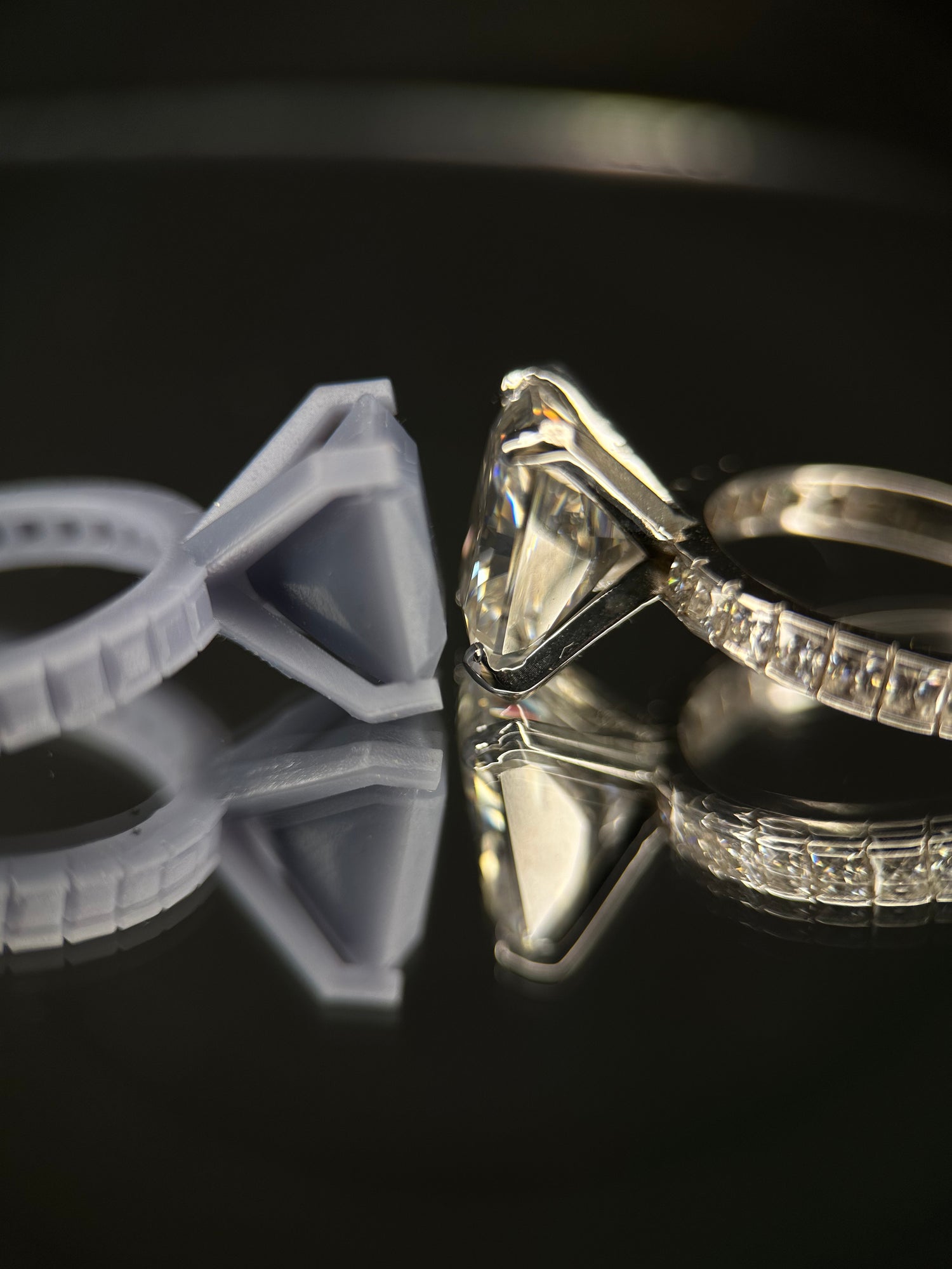 The gray model next to it is the 3d print. We always 3d print first to prototype the model, verify ring size, and to make sure the stones fit.