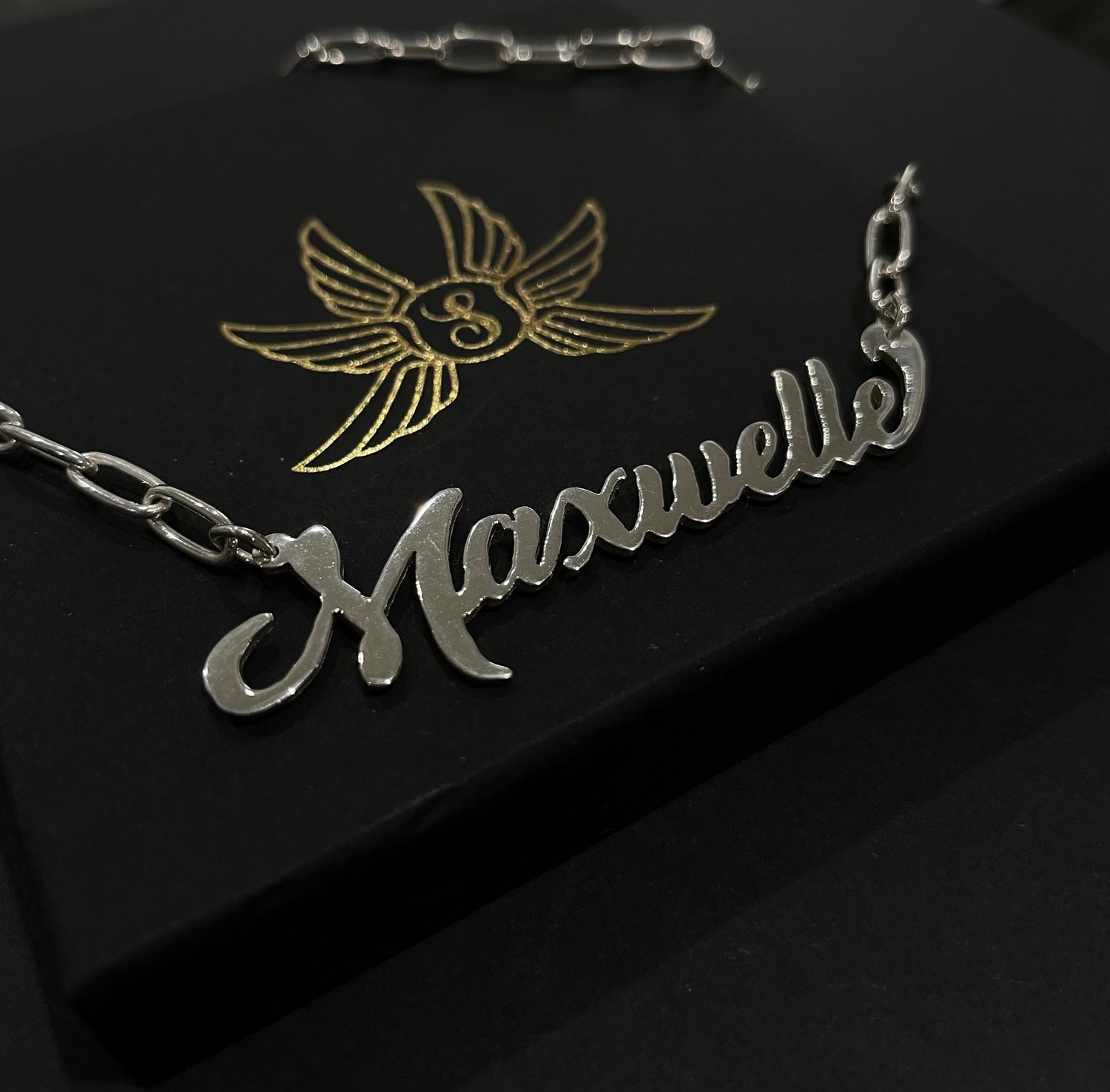 A hand cut silver name pendant necklace. The link style is a staple link chain. Feel free to email us to get one of these started.