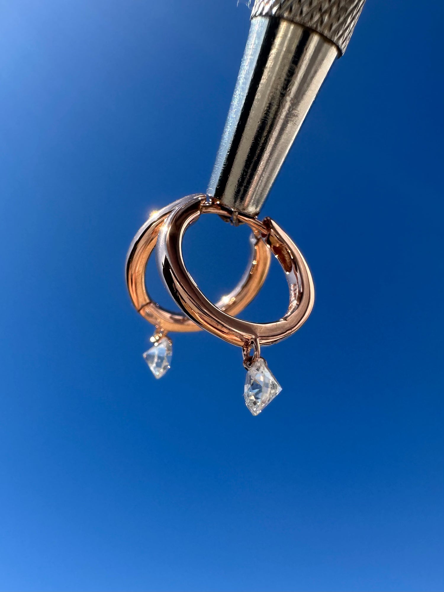 A unique pair of 14k Rose gold earriings. With dangling natural diamonds.