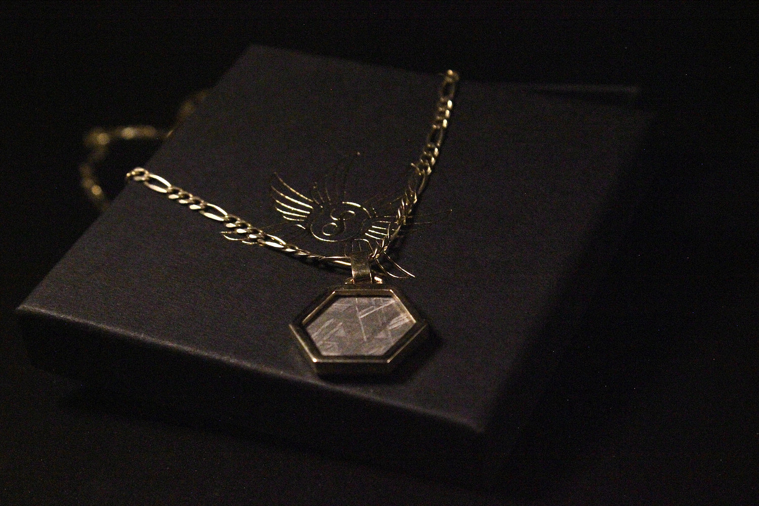 This is a hexagonal meteorite slice set in a 14k yellow gold bezel. The pattern on the piece is only found in meteorites. Its called the Widmanstätten pattern.