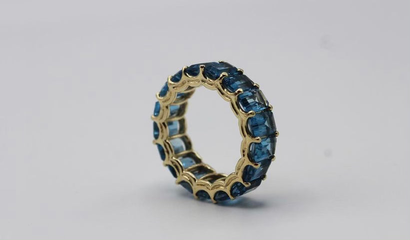 One of my favorite pieces so far. This is a 14k Yellow Gold eternity band set with all Blue Topaz