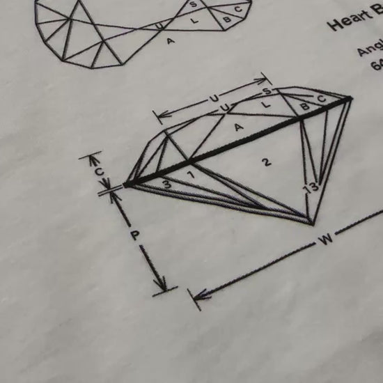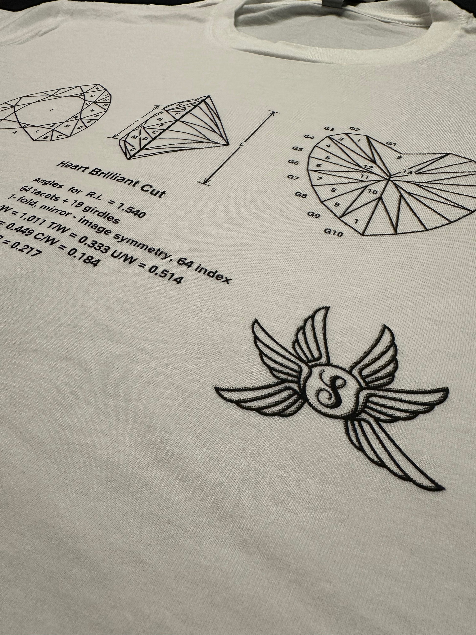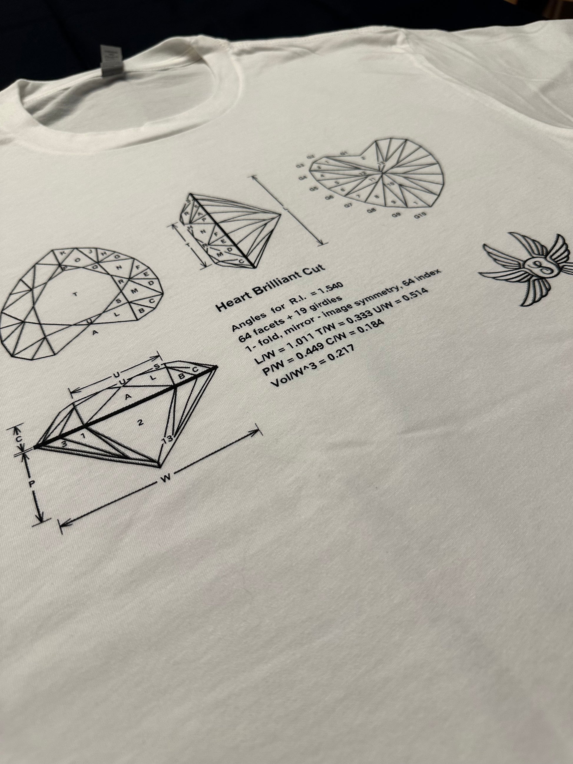 Minimalist, modern, and a nod to gemology — this crisp white shirt features a detailed black line drawing of a Heart Brilliant Cut gemstone diagram. A perfect fusion of fashion and precision, the design showcases the technical beauty behind one of the most romantic cuts in the world of fine jewelry.