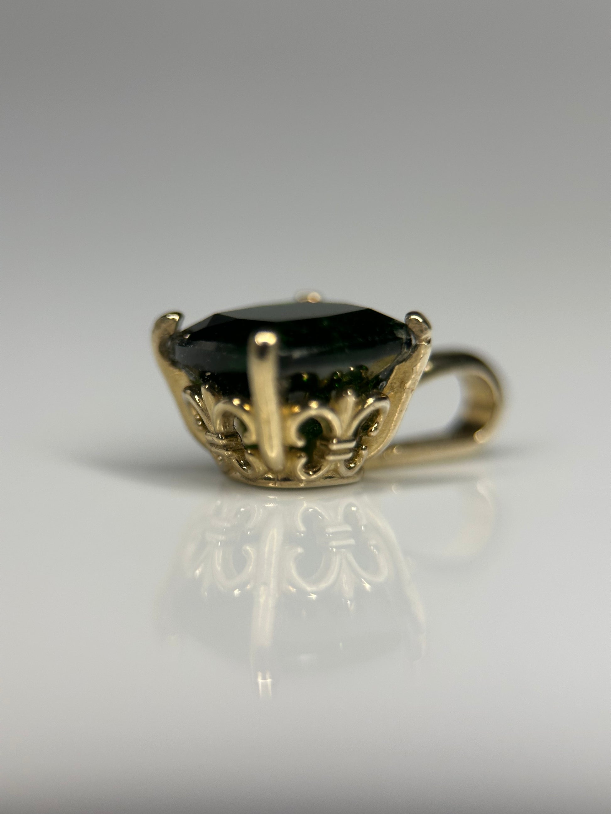 Rich in color and steeped in old-world charm, this pendant features a vivid 7mm cushion-cut chrome diopside, cradled in a detailed 14K yellow gold fleur-de-lis 4-prong setting. The gemstone’s intense, forest-green hue is a stunning contrast against the warm glow of gold, while the fleur-de-lis detail lends a timeless elegance inspired by classical European design.