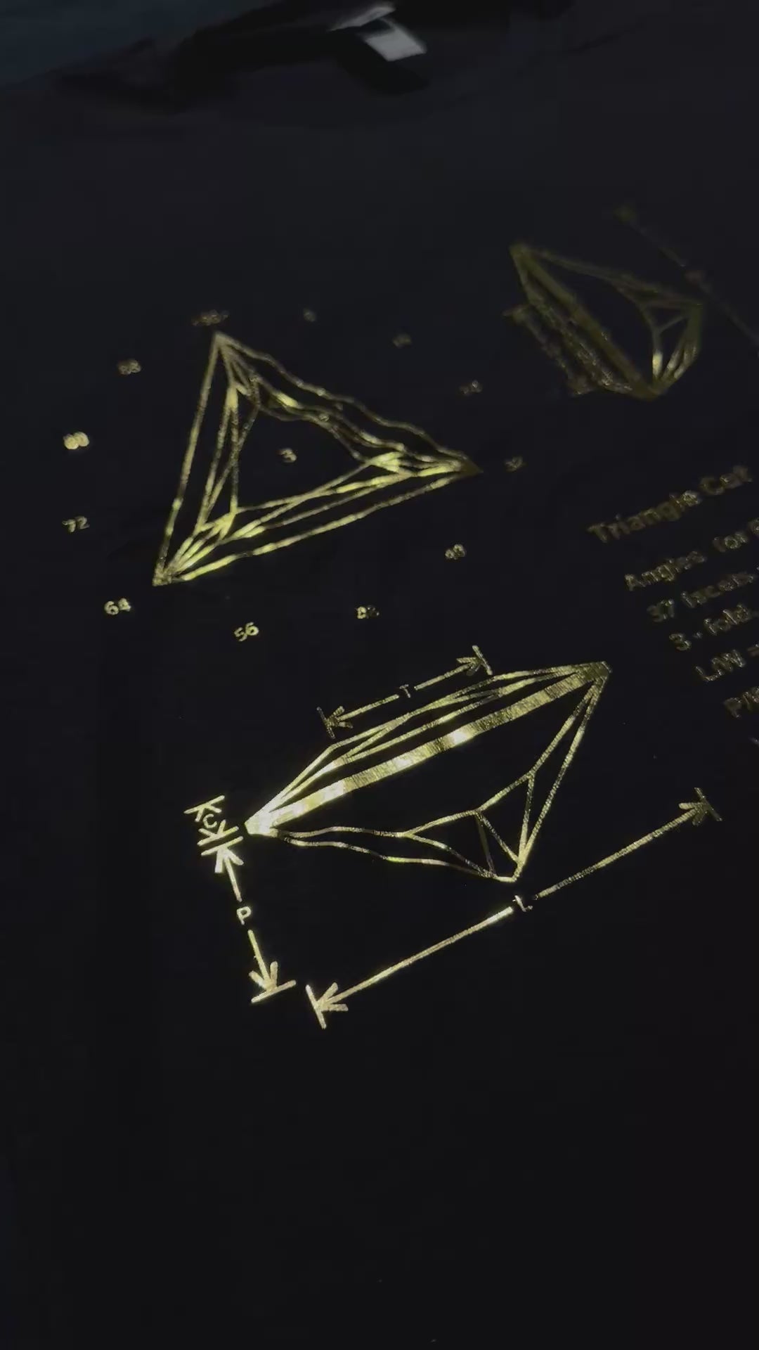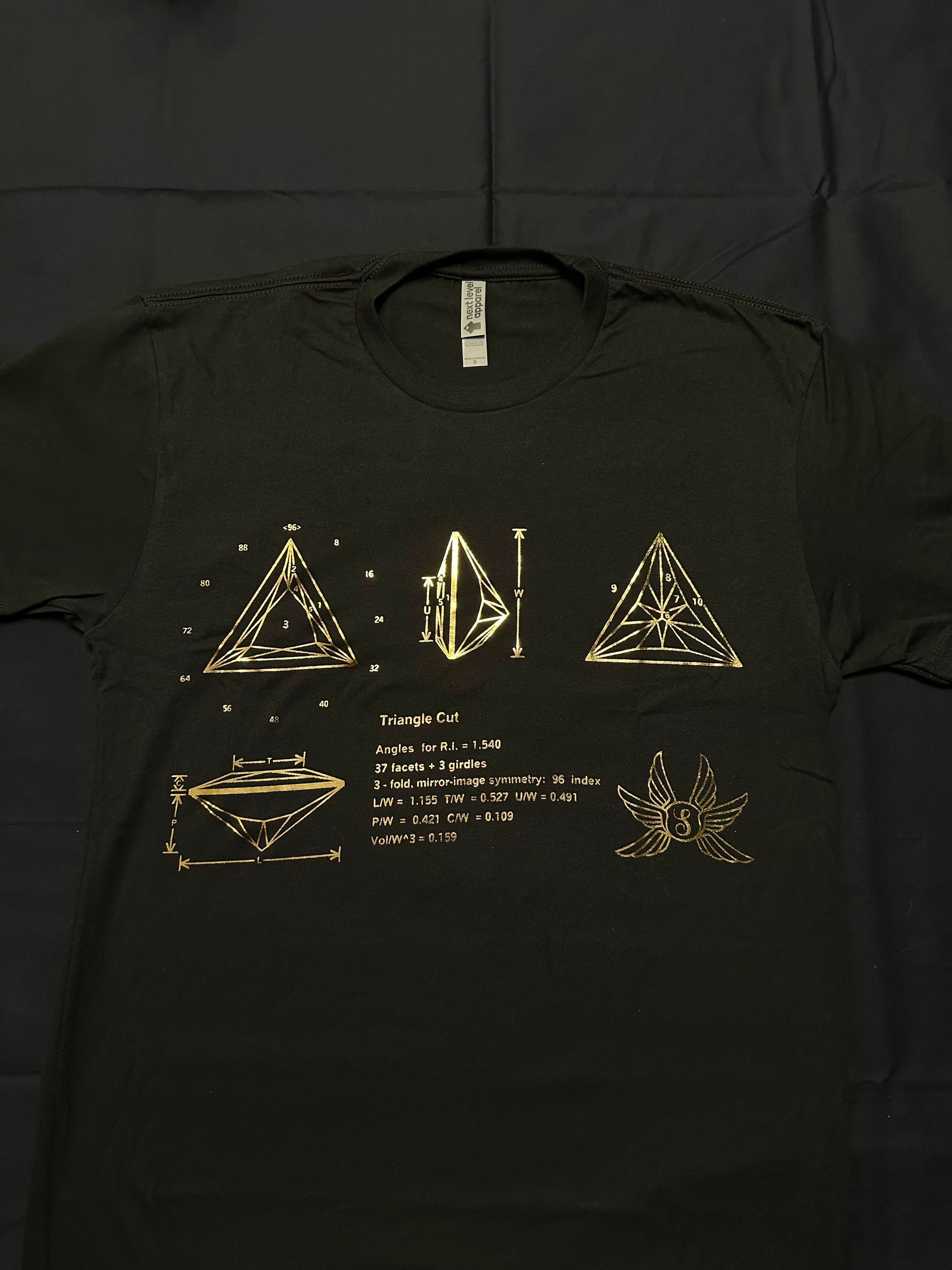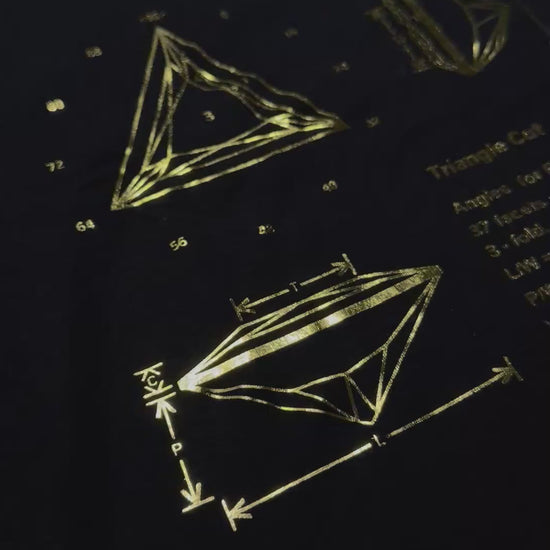 Striking and sophisticated, this black shirt features a precision Triangle Cut gemstone diagram printed in gleaming reflective gold foil. Inspired by the geometry of fine gem cutting, the angular lines and sharp facets catch the light with every movement — making this piece feel like wearable brilliance.