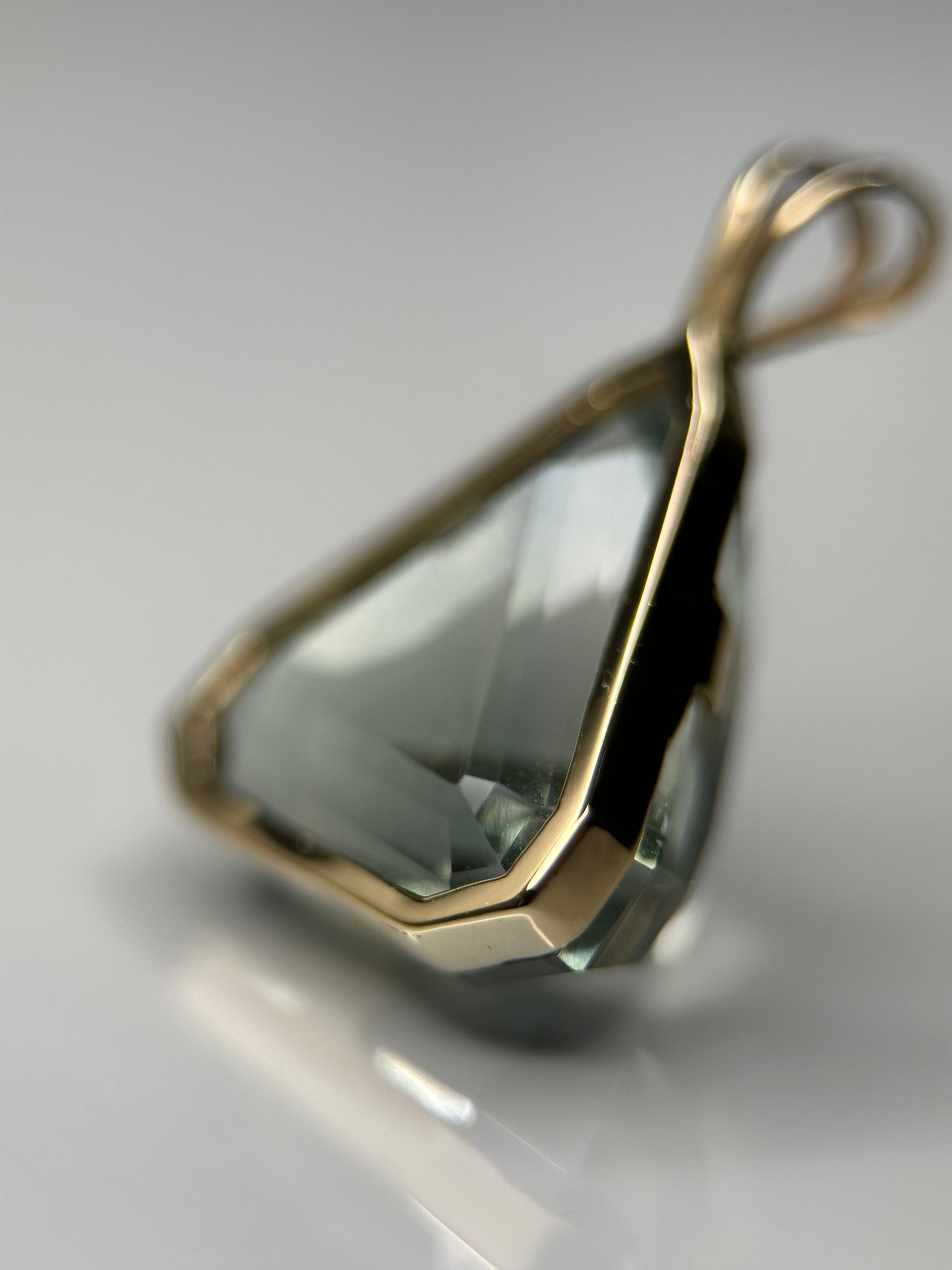 Modern elegance meets ethereal charm in this striking pendant featuring a beautifully faceted trillion-cut prasiolite, also known as green amethyst. Set in a clean, open-back bezel of solid 14K yellow gold, the soft green gem glows with a subtle luminescence that shifts with the light — airy, refreshing, and effortlessly refined.