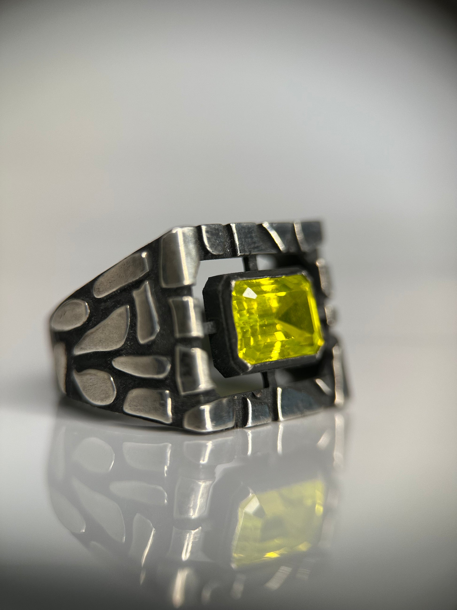 Raw, powerful, and brilliantly unique — this one-of-a-kind ring features a vivid 10x8mm emerald-cut yellow yttrium aluminum garnet (YAG) set at the heart of a rugged nugget-style sterling silver band. Designed with raised, high-polish textures and darkened, oxidized recesses, the surface captures a dramatic play of light and shadow, giving the ring a deep, dimensional character.